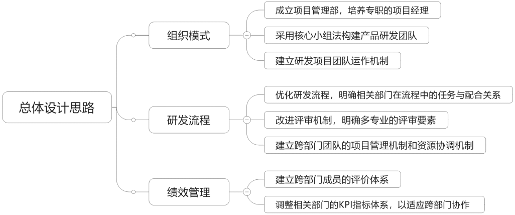 基于上述目标,总体改进思路是“从职能式管理模式向矩阵式转移,实现项目经理负责制,打造跨部门的开发团队,提高研发项目的质量和效率”。
