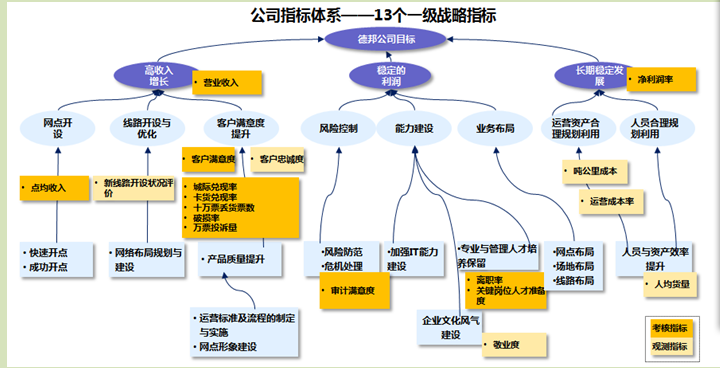 (2)基于德邦的高收入增长、稳定利润、长期稳定发展的总体目标,从销售驱动、业务与产品驱动、成本控制、品牌美誉度等维度,将德邦各类指标区分为考核类和观测类。考核类指标必须由相关部门承接,纳入总裁直管人员的考核体系;观测类指标建议定期分析,可用于部门级及部门内部的考核,最后制定出了收入、净利润(率)、运营成本率、万票投诉量、审计满意度、IT管理支持度等十大核心指标,和市场占有率、人均货量、神秘客户得分、吨公里成本、员工敬业度、关键岗位人才准备度等十五个观测指标。