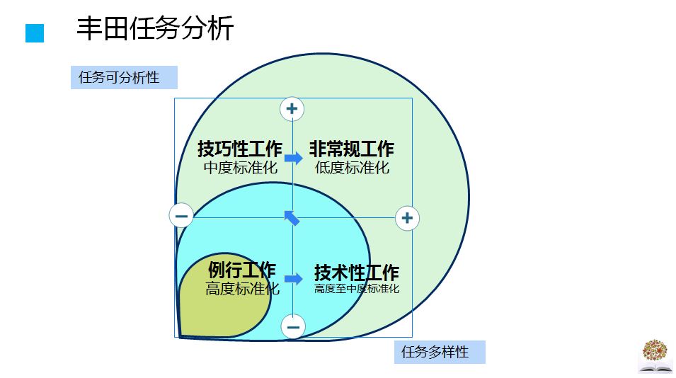 无论是以胜任力为导向的培养方案,还是以任务为导向的培养方案,学习模块的排序都遵循这个原则。这个原则的本质基于维果茨基的舒适区法则,人的学习难度按照舒适区——挑战区的进程。那么,如何确定一项任务是容易的还是复杂的,我推荐丰田人才精益模式中的任务分析。它按照任务是否标准化(是否良构),把任务分为例行工作——技术性工作——技巧性工作——非常规工作。如图11-3所示。
