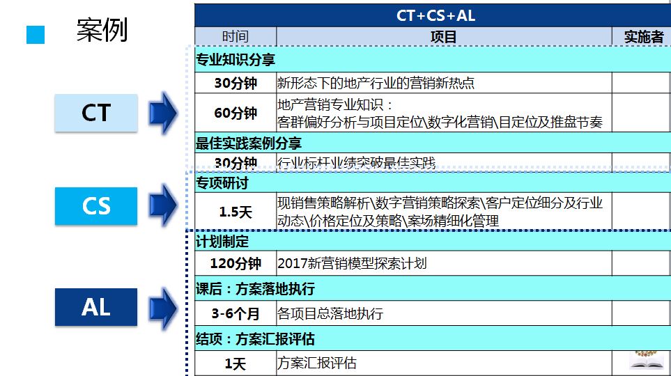 从图11-5发现,三个不同的学习模块(面授、案例学习和行动学习)都是同地产营销新模式相关的,有效地加强了学习的连贯性。在企业中,学习内容由于主观和客观的原因,往往是割裂的。从认知心理学的角度,往往会给学员太多的记忆负荷,无法让学员有效聚焦,也无法让学员真正学会本领,白白浪费了大量的时间和精力。