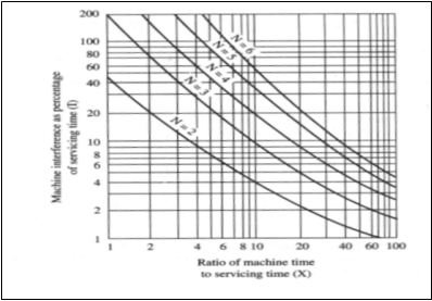 一般在实际生产中,机器干涉时间(排队时间)一般占总工作时间的2%到30%,最多甚至达到50%,但是不通过科学的方法计算衡量,就无法确切的知道在现有的人机比例下机器干涉时间是多少,进而对机器利用率的影响又是多少。而Wright公式就是 解决这一问题的经验总结。当一名工人看管的机器数量小于或者等于6时,我们可以用下图来衡量。首先计算出机器运行时间和控制外时间(servicing time)的比值,根据人机比例查出机器干涉时间百分比,从而计算机器利用率是否达到要求。