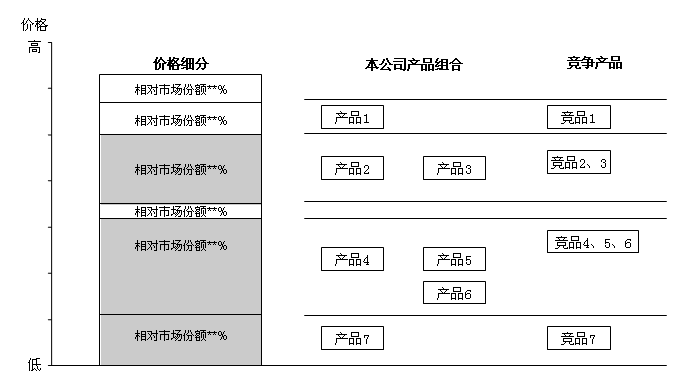 如图11-1所示,价格带战略的基本模型以不同价格带区间里的市场规模为标杆,研究本公司及竞品的产品种类、市场份额的结构特点,制定产品组合、营销策略的方法。