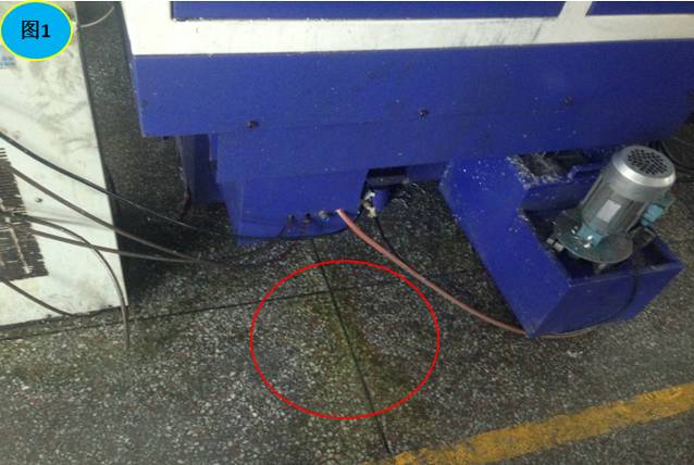 上图是雕洗机切削液漏在地上,形成一摊油。要解决这个油污问题,不停地拖地只是临时措施。其根本原因是要找到油是从哪里冒出来的。具体原因是什么,密封圈、管道、接头松动?看笔者在现场怎么找。
