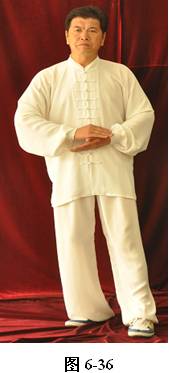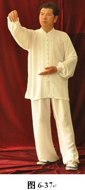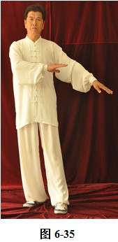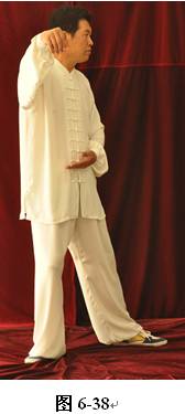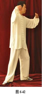 接上式,挤出后,腰微含,右腰向左上方提转,眼神及右脚皆随之转动,右脚向左内转,脚尖转向西南,身体转向正南,顺势右手上翻,手心朝上成穿掌式,左手不动,腰往后微拱,成下採之式,将左右两手拉回右腹前,腰向右外旋转,身体转向西南,左手随转离开右手腕,落至右侧胯上端,面部侧向西北,右手翻转,掌心向下斜指向西北于右胯侧外,重心移落右腿。用左腰提起左脚,脚尖朝向正南,与左肩平行向前迈小半步的距离(见图6-31至6-42)。腰向上提走弧形,两臂随腰向左上划弧,身体随提腰转向正南,两臂抬至略高于肩,重心移向左腿;腰向左撑,随之后拱,带动两臂向左外下划圆收回腹前,重心移向右腿。收回时,左掌翻转掌心向上,右掌心向下两掌微微相合,腰微含,向右侧缓慢旋转打出右肘,腰回转面向正南,眼神转向右平视,腰微拱,随之上提,带右臂往右前方送,右手五指撮拢,指尖朝下变勾手状。臂抬略高于肩,左手仍置腹前,左腰向左外旋转,提左膝身体随之旋转,左脚向左侧迈出一步,右脚尖随身转体内转,朝向东南,身体面向正东。左腰轻轻向上提,借势左手向前打开成掤式,重心前移成左弓步;腰微拱,后腿膝微屈,重心移向右腿,左手随之翻转掌心向下按,眼神向前平视。
