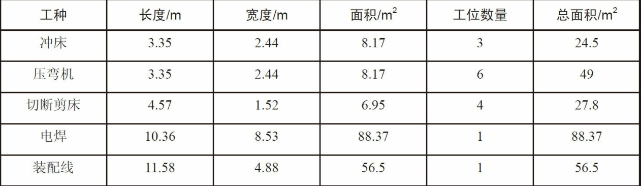 要准确衡量一个工位所占空间大小,首先要测量机器的长度和宽度,确定工位的数量及计算总面积。某工位布置的基础数据如表5-8所示。