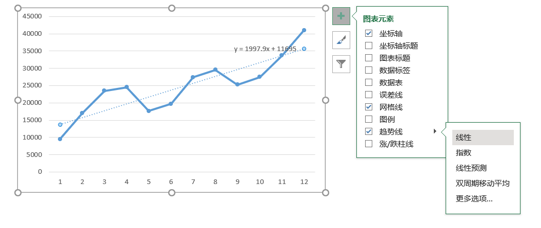 这样可以在图4-16中轻易得出线性方程,其方程式Y=1997.9X+11695,其中1998(四舍五入)作为初始水平值,11695则为初始趋势值。