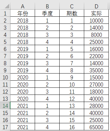 2018年第1季度开始,到2020年第4季度,共有16期的历史数据。使用三指数平滑法,同样离不开初始值的确立,这个可以称为观测值,然后通过观测值得出的因素数值,并引用在其他周期上,这些称为实验值,最后就是希望得到预测结果的预测值。因此2018年4个季度的数值可以视为观测值,2019年第1季度到2020年第4季度的数值则为实验值,最后就是预测,如果要预测2022年全年4个季度,那么这4个季度的数值就是预测值了。