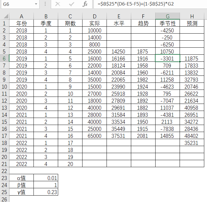 这样就得出了第5期(即2019年第1季度)的水平值为19463,趋势值为3544,季节性因子为0.76,预测值为11316,并如此类推,可以得到后续各期的水平值,趋势值和预测值。