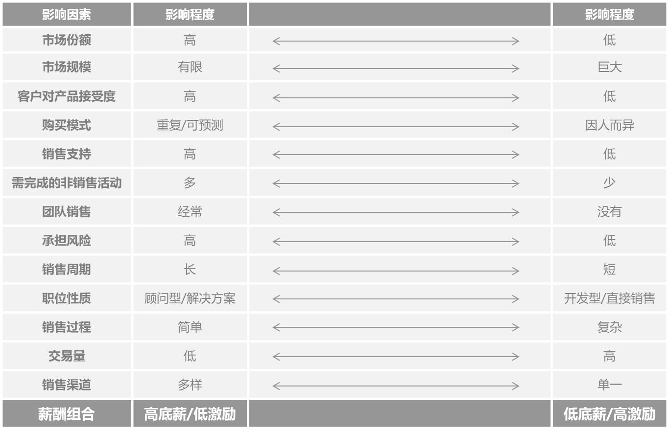 除销售人员对交易达成的影响力外,还有许多因素驱动薪酬组合的设定:
