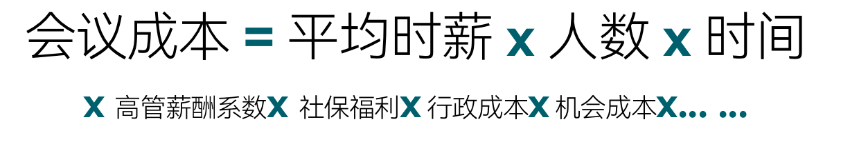 面对越来越复杂的环境变化与越来越庞大的组织,我们希望通过会议的拉齐、沟通、讨论、共识来解决问题。但会议产出的价值真的如我们所愿吗?我们知道会议也是有巨大的隐性成本的吗?你知道平均一个会议要花多少钱吗?也许你从来没有这个概念,更是没有认真计算过。现在我们来看这样一个高管团队会议成本的计算公式。我们也可以以此为依据来算算经常开的会议到底花了多少钱,而会议的产出价值究竟是大于成本支出还是小于成本支出?