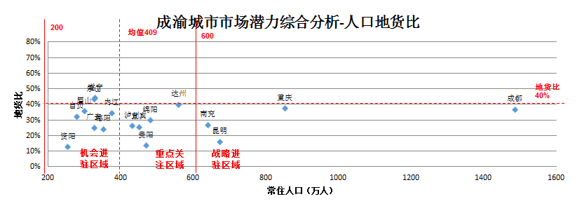 市场潜力从常住人口和地货比两个维度考虑,地货比较低且人口规模相对较大代表市场潜力较大。战略进驻区域城市共4个,分别为成都。重庆、昆明及南充;重点关注区域城市共5个,分别为达州、绵阳、宜宾、泸州及贵阳;机会进驻区域城市共6个,分别为内江、德阳、广安、眉山、自贡及资阳。