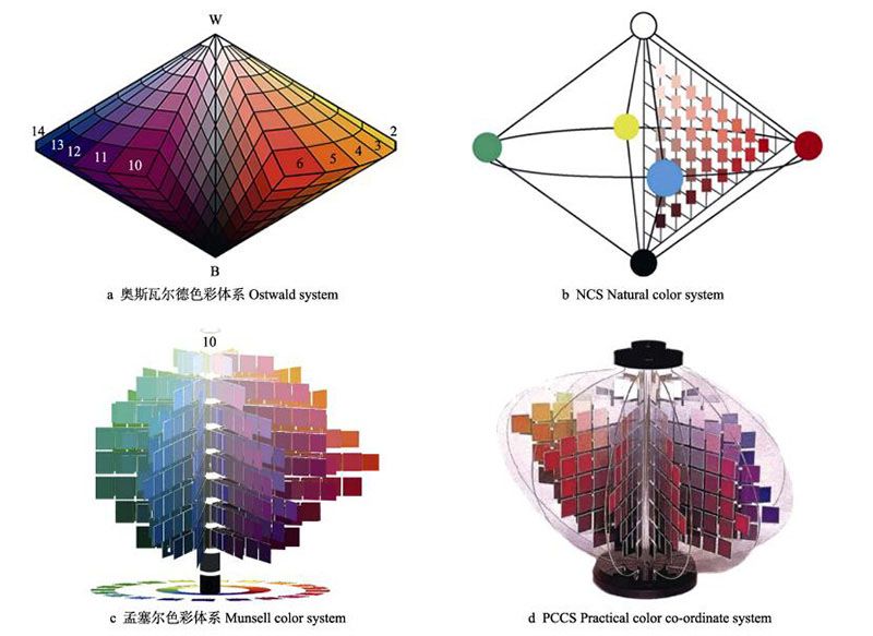 不同的地区使用不同的色彩体系,常见的色彩体系有奥斯瓦尔德色彩体系、瑞典自然色系NCS、孟赛尔色彩体系及日本色研所色彩体系PCCS,如图8-3所示。其中,奥斯瓦尔德色彩体系(奥氏色彩体系)是建立最久远的色彩体系,NCS是受奥氏色彩体系的启发,加以改良后的比较简单易懂的色彩体系,现在在欧洲应用比较广泛。孟赛尔(孟式)色彩体系是在美国常用的色彩体系。在我国和日本则通常使用日本的PCCS色彩体系。这些色彩体系采用色相、明度、饱和度的树形结构。