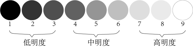 明度:色彩的明度是色彩的明亮程度,色彩中含白越多,明度就越高,看起来也就越明亮。相反,色彩中含黑越多,看起来越暗,明度也就越低。根据孟赛尔色彩体系,按照由黑到白把明度等差分成九个色阶,即“明度九调”,如图8-5所示。