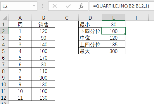 图3-14函数中的B2:B13后面数字的1和3表示第一个四分位点(即1/4)和第三个四分位点(3/4),四分位距则是 135- 100 = 35 ,从而可以知道50%的销售数字都在这35的距离里波动。