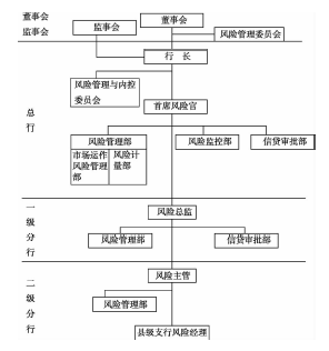 建设银行的风险管理架构层次分明,各层级岗位设置及职责和权属如下:总行设首席风险官,协助行长组织全行全面风险管理工作。一级分行设风险总监,由总行任命,对首席风险官负责,向首席风险官和所在分行行长双线报告工作。一级分行设风险管理部和信贷审批部,业务量较大的一级分行设置专门的项目评估部门。二级分行设风险主管,对一级分行风险总监负责,向风险总监和所在机构负责人双线报告工作。二级分行、支行设风险管理部,向县级支行派驻风险经理。如图7-2所示。