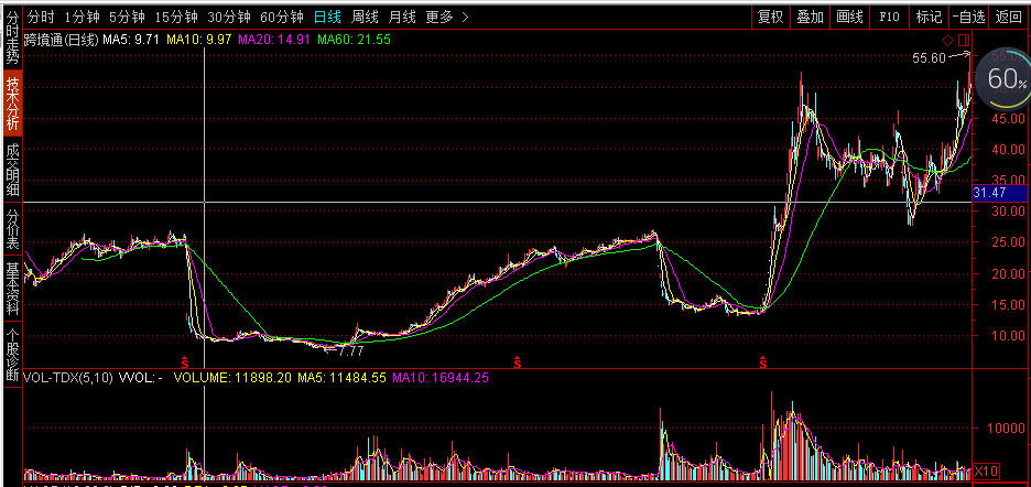 以百圆裤业(002640,后更名为跨境通)为例,公司于2014年通过收购跨境电商平台“环球易购”,实现企业的转型与“触电”。2014年4月4日,公司以“正在筹措重大资产重组”为名进行了停牌,2014年7月17日复牌,复牌后,在公司发布完成对环球易购的并购公告后的一个月内,公司股价从15.37元/股直接飙升到最高50.10元/股,短短一个月时间,公司股价提高了300%多。如图16-1所示。
