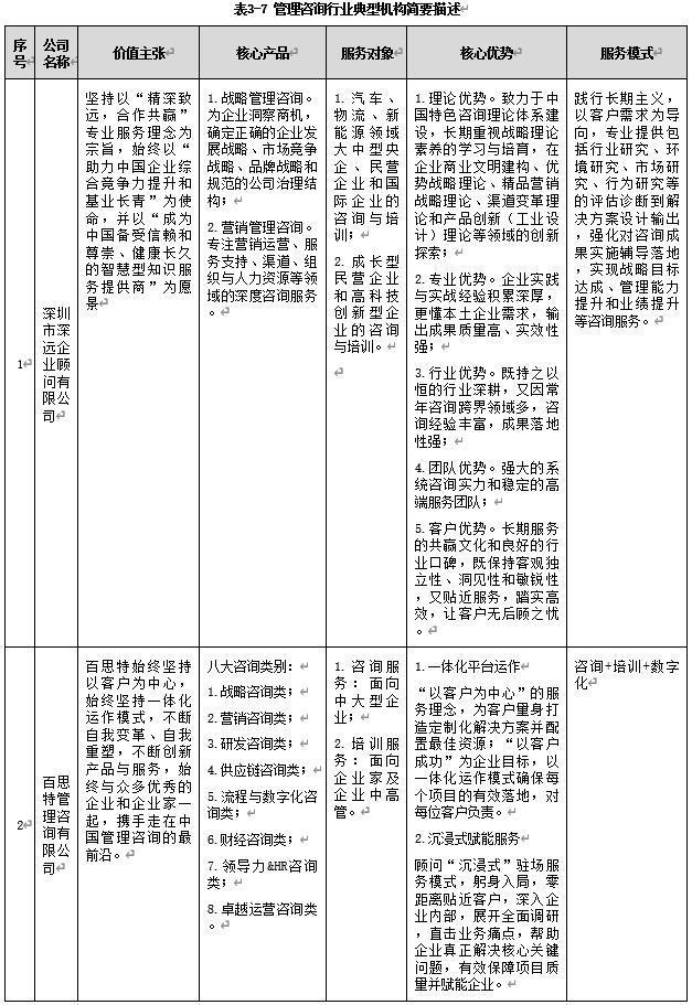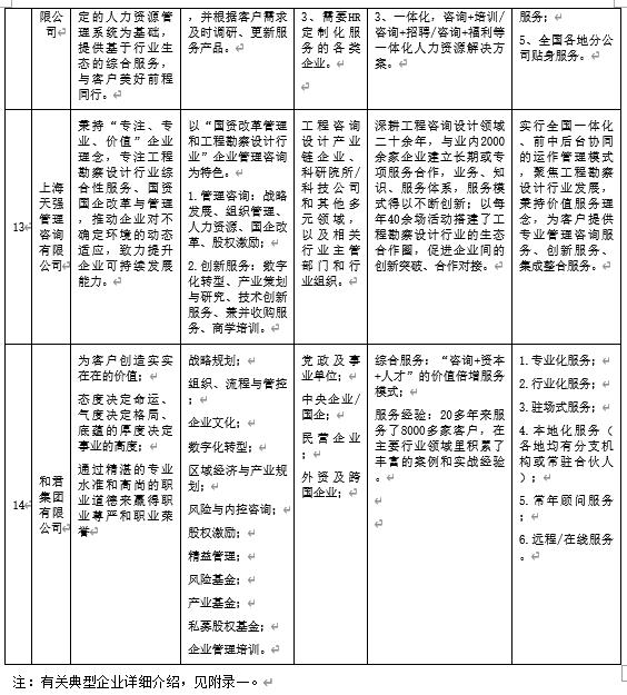 本报告中所指的“典型企业”是指知名度较高、创办时间长、商业信誉好、有发展潜力和综合实力强的企业,要求企业在咨询理论的独创性与特色性、咨询市场实践的影响力和自身信息化、数据化建设探索取得成效,具有行业先进性、示范性和代表性。我们在这里所介绍的典型企业,并不是什么全能冠军,也没有什么全能冠军,而是在不同服务板块或领域,某一个方面相对比较突出、比较专业的管理咨询企业。这样有特色的咨询和培训公司在行业健康发展中会发挥一定的“专精特新”带头作用。我们分别从价值主张、核心产品、服务对象、核心优势、服务模式五个方面对这14家典型管理咨询机构进行简要描述。如需进一步了解每一家典型咨询机构更详细的介绍,可以参见本书的附录一。
