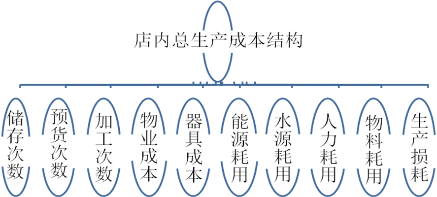 店内总生产成本结构,是指原辅调料进入门店后产生的所有成本项目,也就是从进店到售出期间的成本项目情况。