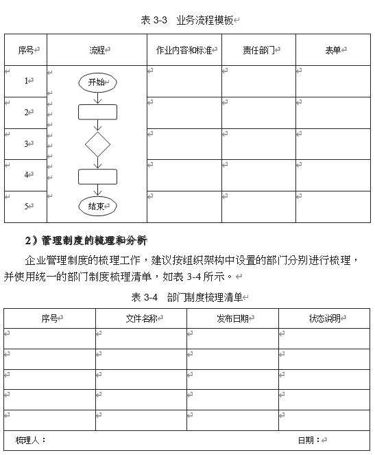 在正式制作一张流程制度清单前,还需要完成以下两个步骤:一是业务流程的梳理和分析;二是管理制度的梳理和分析。