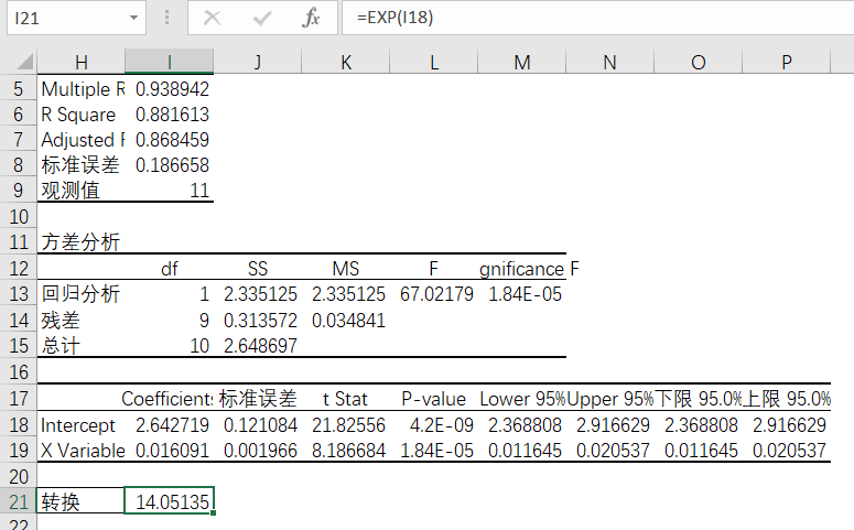 不过要注意的是,回归分析得到的y值(销售额)对数变换之后得到的,应该建立公式的时候应该变换回去,使用的Excel函数是Exp,得到值为14.05(保留两位小数)。