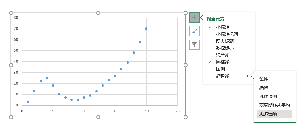 当然,Excel也有一个简单的方法。直接在图示上添加对应的趋势线,从更多选项中,寻找并建立适合的曲线方程。