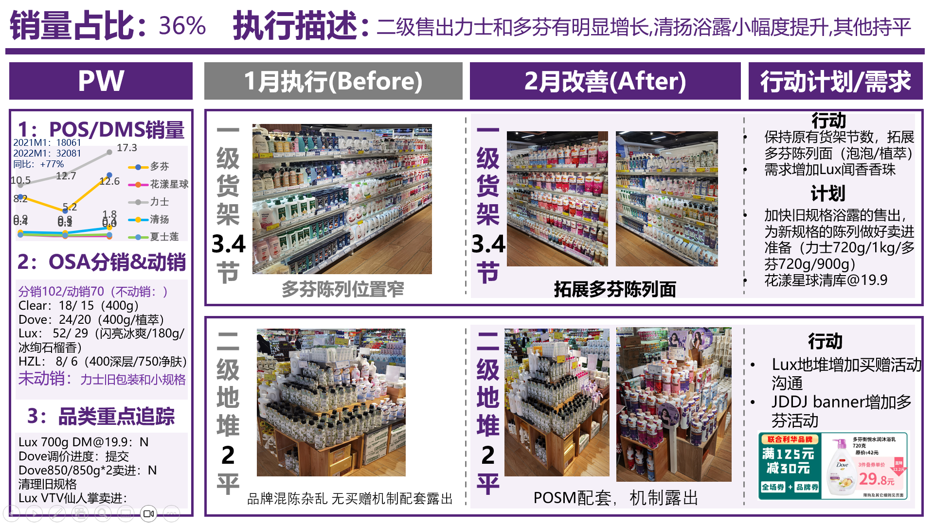 最后,第三张幻灯片来自对“洗衣护衣”品类的追踪分析,一方面通过2月份的新品上架带来了整体主货架多了5个陈列面位;另一方面在二级陈列上增设了醒目的促销台卡,尽管这个品类对于上个月的POS售出数据有小幅下滑,但是执行的优化和进步会让当地销售团队对后续的生意发展充满信心,坚持做正确的事情一定会有正向的生意回报。
